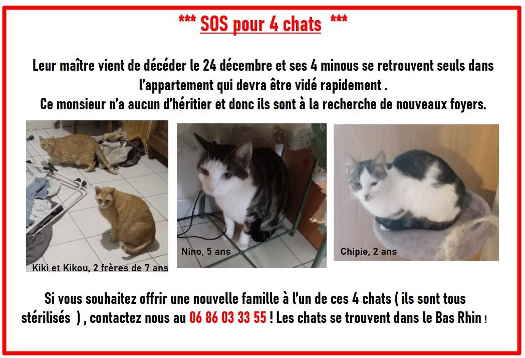 C'est un APPEL de la dernière chance pour eux : si vous disposez d'une pièce d'isolement et si vous avez la patience de les soigner durant 6 semaines, contactez nous au 06 86 03 33 55 !